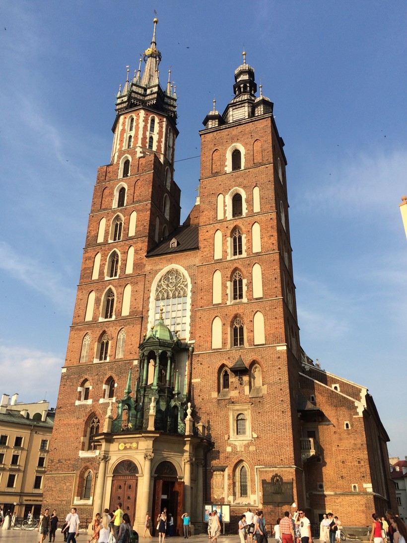 Мариацкий костёл или Церковь Успения Пресвятой Девы Марии выходит на Рыночную площадь своим главным фасадом. Это католический приходской костел готической архитектуры. Внутреннее убранство храма носит элементы не только готики, но и барокко и модерна. Храм очень популярен у прихожан: в воскресенье внутри яблоку негде было упасть. Поляки, в большинстве своем, истово верующие католики, чем сильно отличаются от своих соседей - чехов. В 1962 году костел получил от Ватикана титул малой базилики. Высокая башня, на шпиле которой установлена золоченая корона, называется Хейналицей. Каждый час с нее доносится "мариацкий хейнал", то есть сигнал точного времени, который подает трубач.