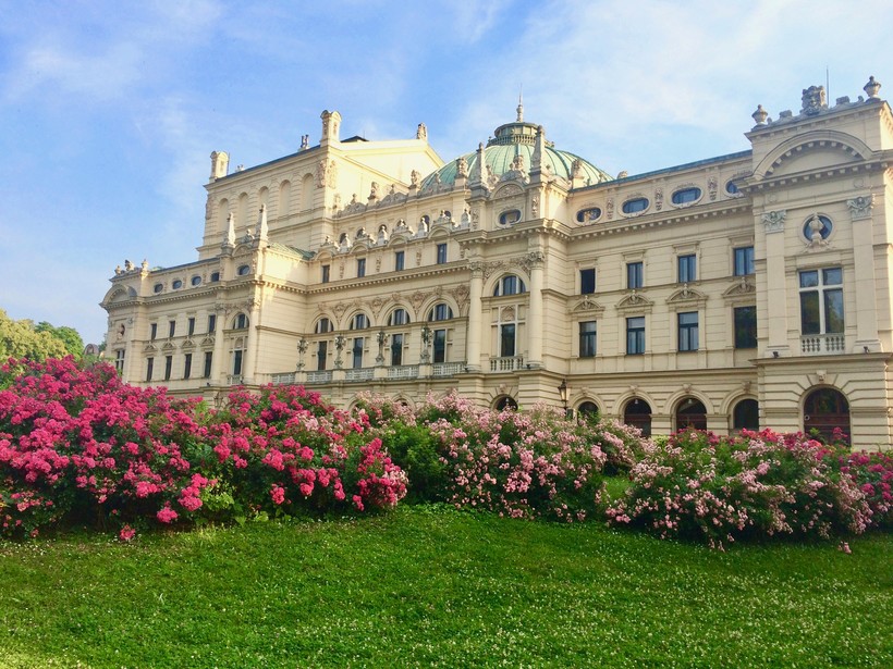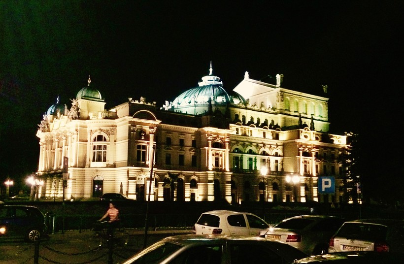 В Кракове много зданий с красивой архитектурой, например Театр им. Юлиуса Словацкого. Вечером они эффектно подсвечены.