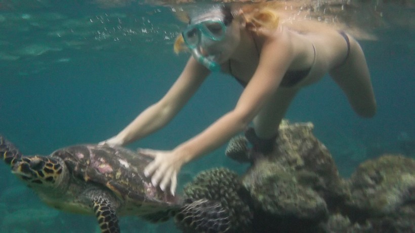 Огромное количество разноцветных рыб разных размеров, начиная с мальков размером с палец и заканчивая большими, которые походили на акул, шокировали и пугали. Скаты размером с большой обеденный стол, которые манили в глубину, так хотелось их потрогать. Ну а черепахи, которые стаями к нам подплывали, были просто чудесными. Они пытались укусить за палец, поцеловать меня в маску, которая защищала меня, слава богу, от их любопытства.