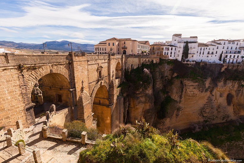 Если хотите пополнить свою коллекцию фотографий из отпуска чем-то действительно помпезным, то прямо из Центра Ронды по узкой крутой дорожке от площади Марии Ауксилиадоры спускайтесь в самый низ ущелья. Да, ног после спуска не чувствуешь, особенно если надел на прогулку сланцы. Не повторяйте моих ошибок, прячьте ноги в удобные кеды и у Вас получится великолепная фотография со дна горного ущелья с видом на древнейший мост.