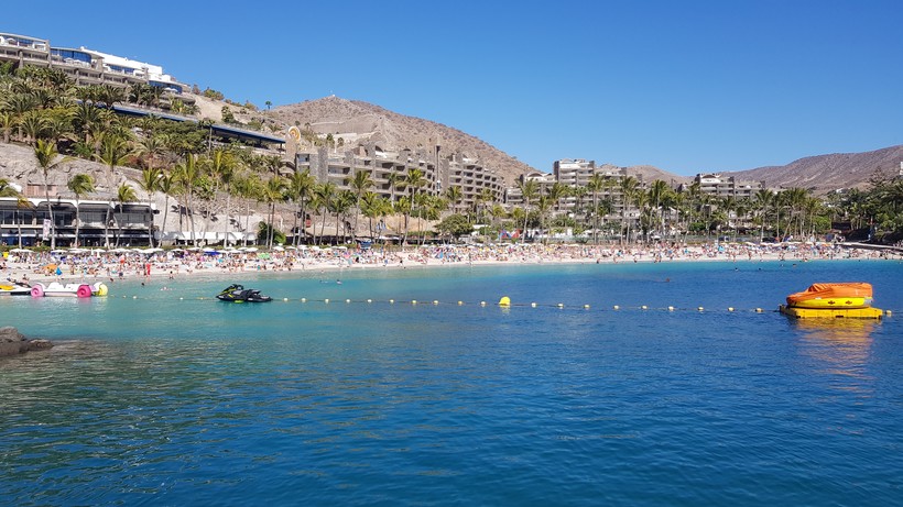 Приятные впечатления усилились, конечно, утром, когда мы пошли на пляж с белоснежным песком и почувствовали себя словно на Мальдивах. Многие пляжи на Гран-Канарии оборудованы волнорезами, которые защищают бухточки от волн, поэтому купаться комфортно и взрослым, и детям.