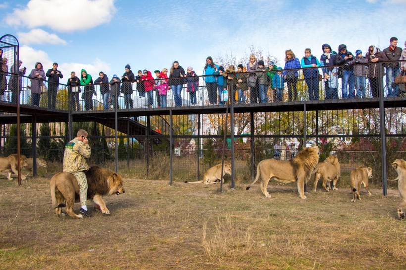 Дальше мы отправились в Тайган. Он расположен в 4.5 км от Белогорска. Это крупнейший питомник в Европе, где насчитывается более 50 львов и других животных и птиц. Это увлекательное посещение вас не утомит даже в самый жаркий день. В Тайгане можно отдохнуть в сени деревьев на скамеечках, можно подкрепиться в кафе. Любители экстрима могут подержать на руках тигрят или львят и запечатлеть себя на фото. В парке много клумб с цветами, деревьев, кустарников. И если раньше я всегда предвзято относилась к зоопаркам, где животные томятся в тесных клетках, то здесь убедилась, что и животные могут жить в комфорте, хоть и не на свободе. Сытые львы гуляют по достаточно просторной территории, на которых можно полюбоваться с высокого моста.