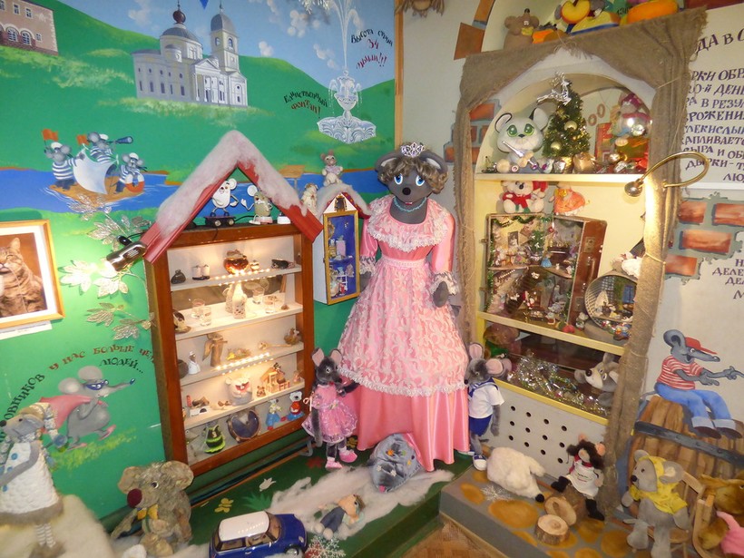 Прежде всего, вас встретят мышиные царь и царица и проведут в мышиные палаты. Там покажут представление с участием ростовых кукол (конечно, мышей). Сие действо ориентировано в первую очередь на маленьких туристов. Взрослым предлагаю пройти дальше. Например, в музей мыши. Здесь увидите тысячи этих грызунов и услышите много увлекательных историй про них. Большие, маленькие и совсем крошечные. Из стекла, камня, ткани, соломы, бумаги… Различного возраста (старшей более 100 лет), профессий и из разных стран. Настоящее мышиное царство. Многие прибыли сюда от известных людей. Булат Окуджава презентовал музею аж пятикиллограмовую мышатину.
