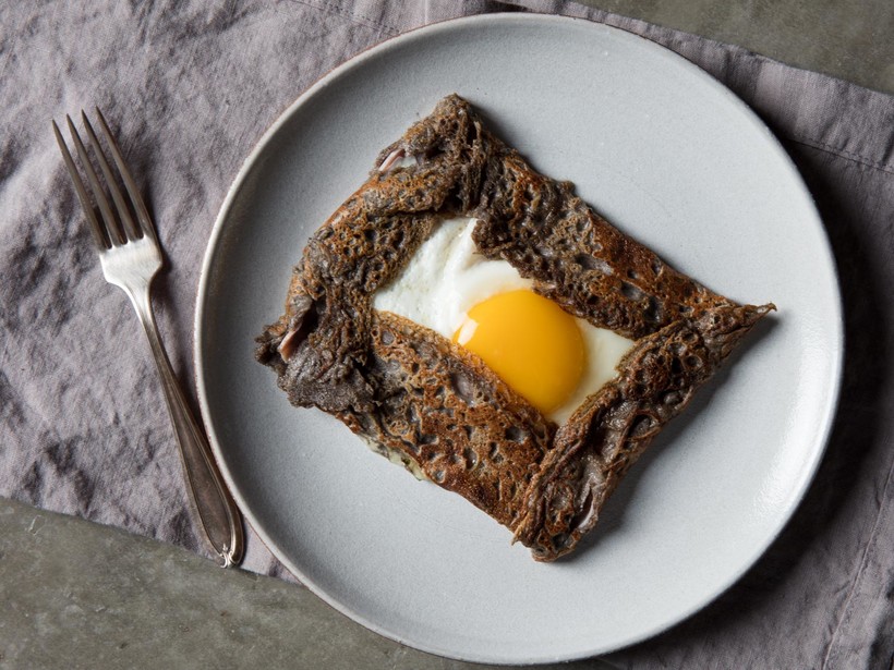 Итак. В Кемпере делают очень вкусные блины из гречневой муки (по-моему, туда даже не кладут яиц, только в начинку уже), солоноватые, довольно пресные. Я не большой фанат сладких блинов, меня даже бельгийскими вафлями не возьмешь, а вот если соленое – это мне нравится. В итоге, мы изучили ассортимент, оказавшийся довольно большим, и заказали: подруга – блин с яйцом, шампиньонами и помидорами, я – блин с козьим сыром (я его фанат). Оказалось, что мой – это прямо местный-местный вариант.