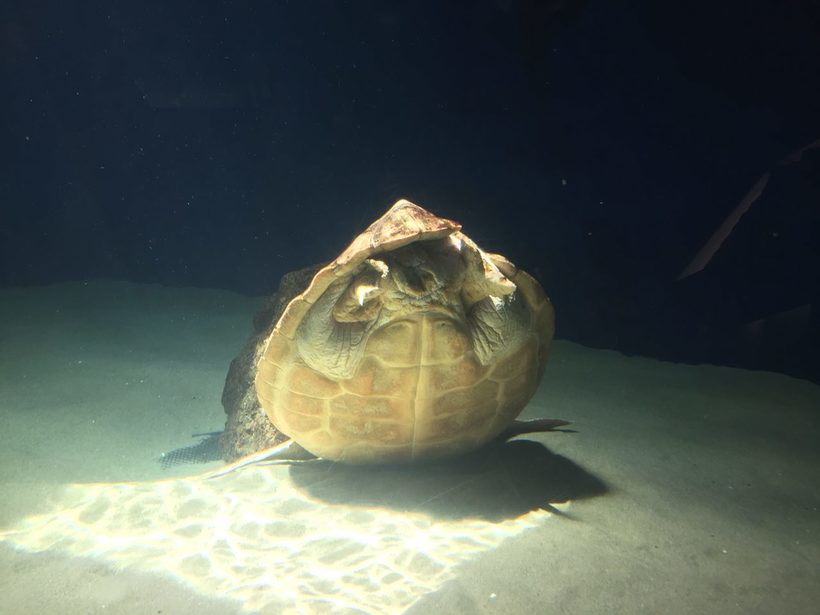 Вдохновившись зоопарком на следующий день отправились в океанариум. И вот тут я однозначно могу сказать: не советую. Пожалуй, все, что вы должны знать об океанариуме Сан Диего передает эта фотография выше. Сплошное разочарование. Даже черепаха проторчала в такой позиции минут 15, с другого ракурса ее так и не удалось увидеть. Океанариум маленький и ничего интересного там нет. Мило, но не более того. 18,5$ определенно не отбились.