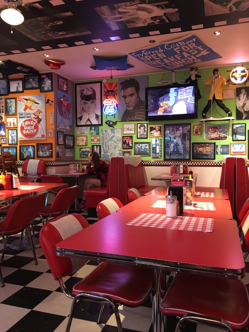 После такого плотного завтрака есть не хочется целый день. Поэтому посетить какие то кафе или рестораны не получается. В Брайтоне их великое множество на любой вкус и кошелёк. Так получилось, что после посещения Павильона, полил жуткий ливень, так что пришлось бегом бежать в кафе. Выбор кафе оказался случайный, первое по дороге, но я решила попробовать английский сидр. Кстати если кухня в разных кафе разная, в зависимости от типа заведения, напитки везде традиционные местные. Кафе оказалось с американской кухней в стиле 50-х годов. Но сидр замечательный, настоящий английский.