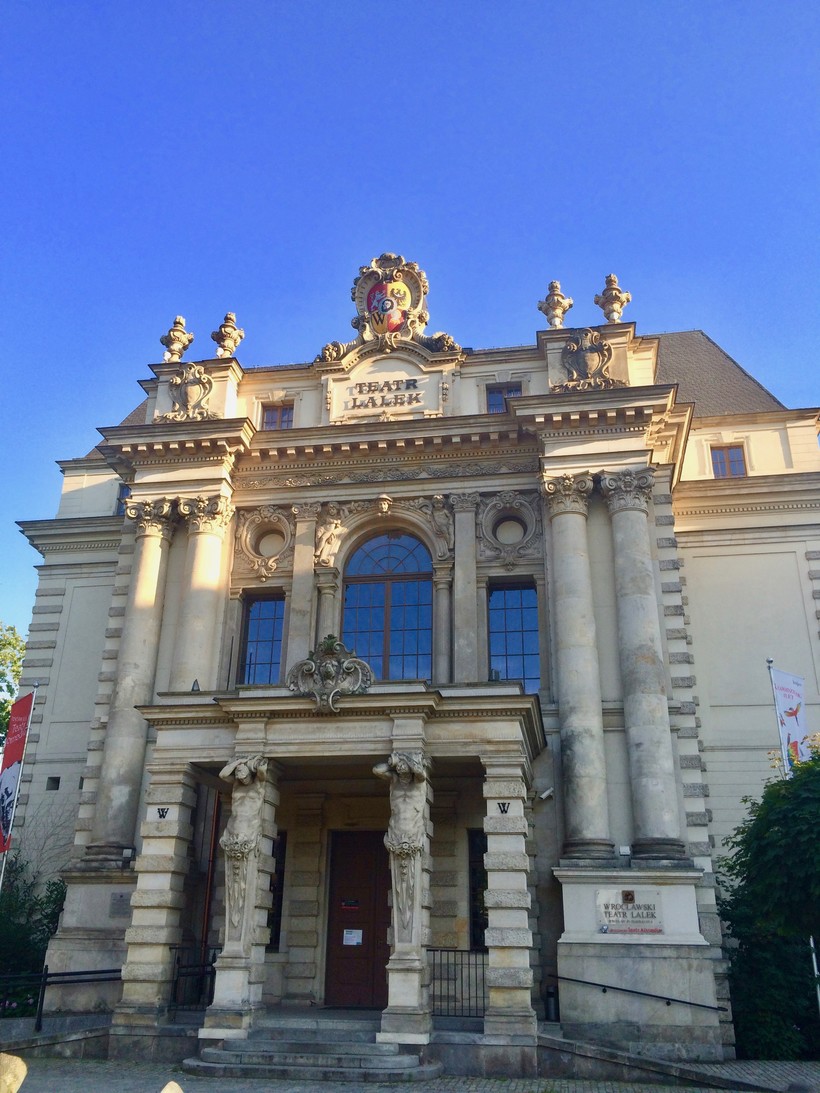 Прогуливаясь по городу, мы набрели на симпатичный кукольный театр, особенно нас развеселило то, как это называется по-польски. Здание построено в стиле необарокко.