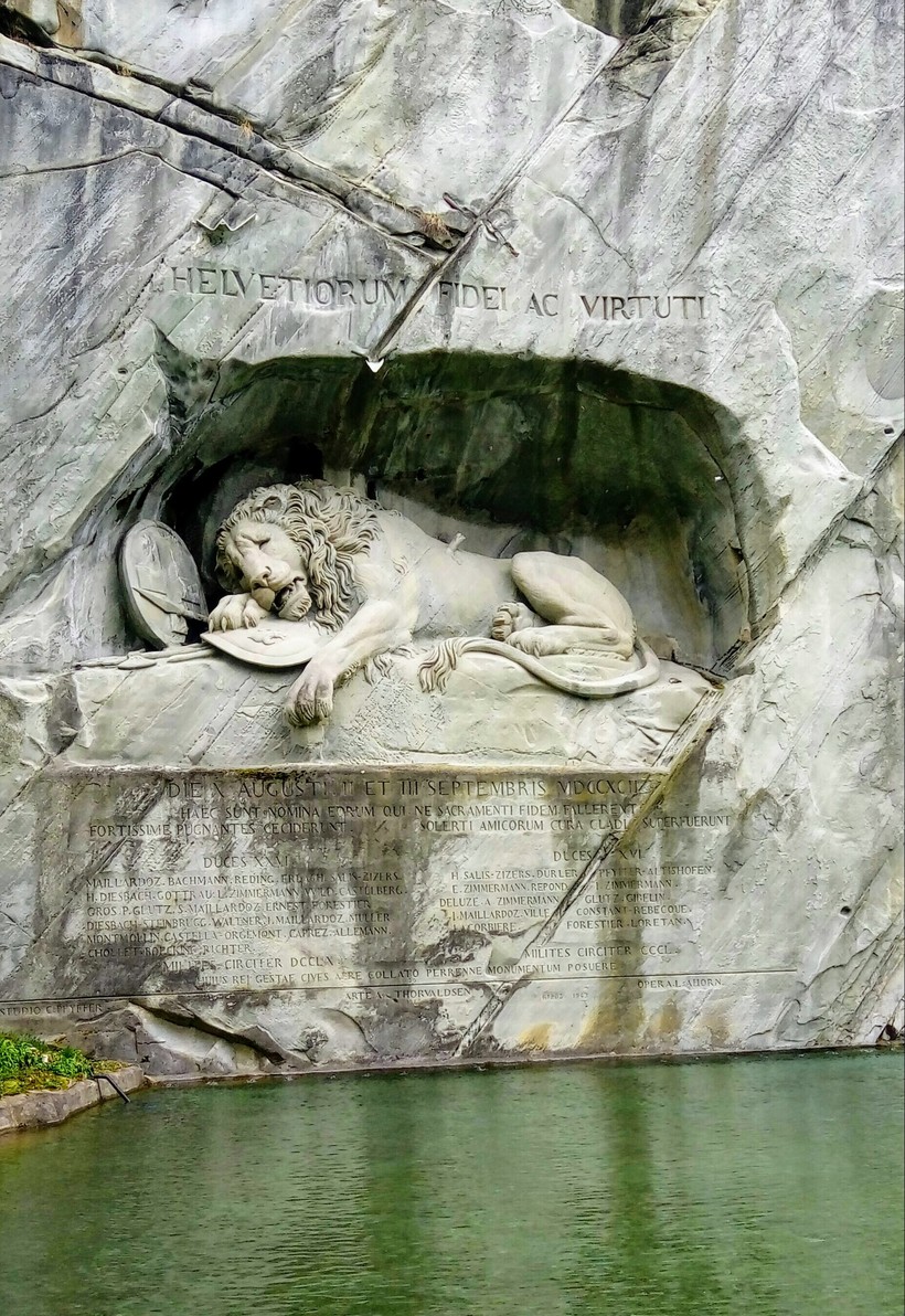 Пожалуй, самое большое впечатление на меня произвел Умирающий лев - гигантская скульптура 6 метров в высоту и 10 метров в длину, вырезанная прямо в скале. Это одна из главных достопримечательностей Люцерна, памятник был воздвигнут в честь солдат Швейцарской гвардии, погибших во время штурма дворца Тюильри в 1792 году, защищая жизнь французского короля. Удивительно, как пришла к Торвальдсену, нарисовавшему эскизы, такая идея – вырезать огромного льва прямо в скале? Как потом Лукас Ахорн это технически осуществил, да так, что лев кажется настоящим и его безумно жаль?