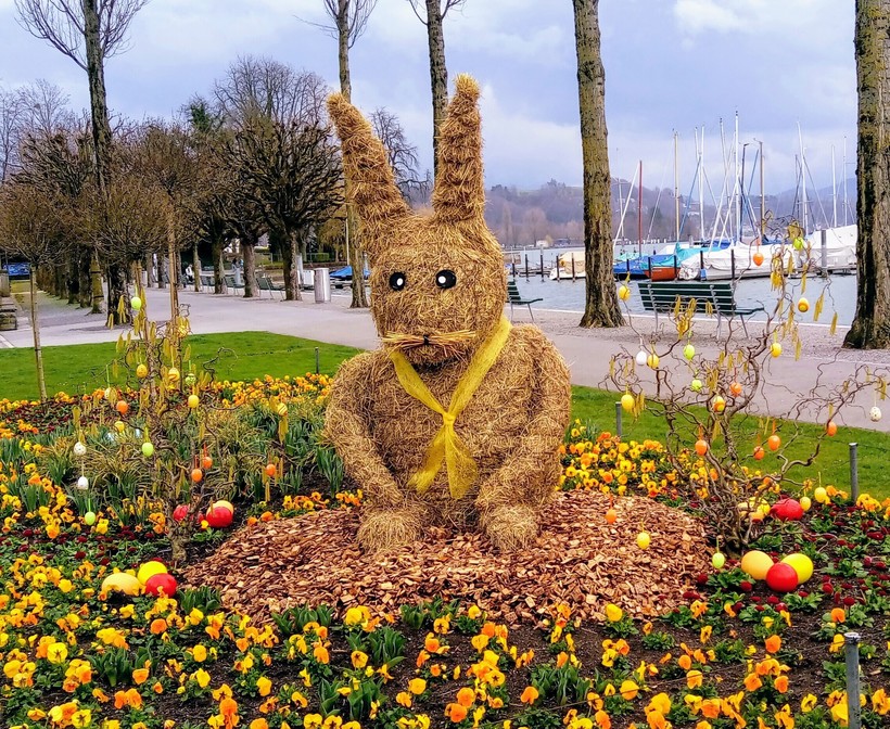 Мост Капельбрюкке выходит к площади Шваненлатц (Лебединая площадь), где расположены кафе, часовые и сувенирные магазины. Но я была на Пасху, все было закрыто. К этому сложно привыкнуть, что в праздничные дни торговля тоже отдыхает. Зато город был украшен.