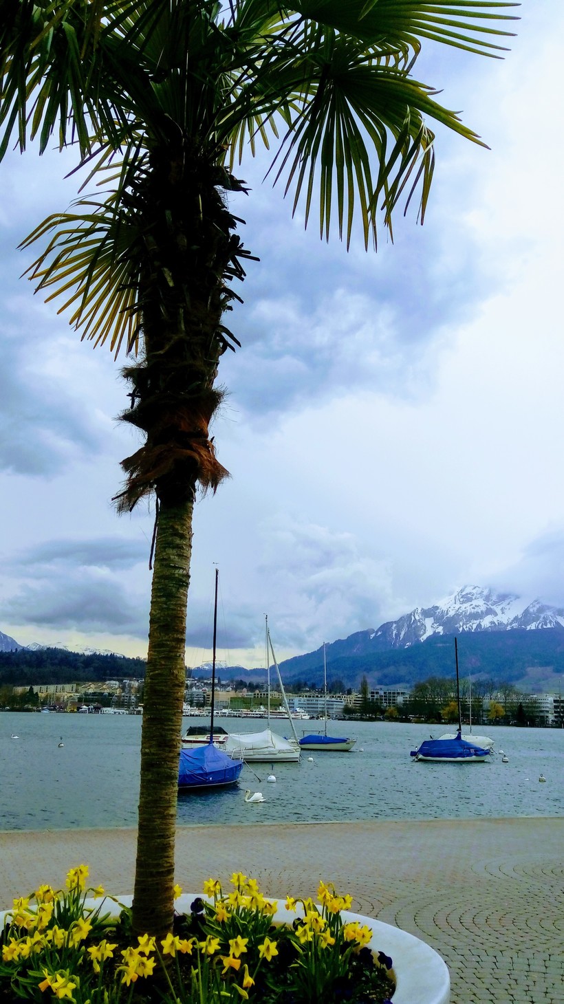 Порадовала прогулка по набережной Фирвальдштетского озера. Одновременно видишь зеленые пальмы, много белых лебедей и горы покрытые снегом.