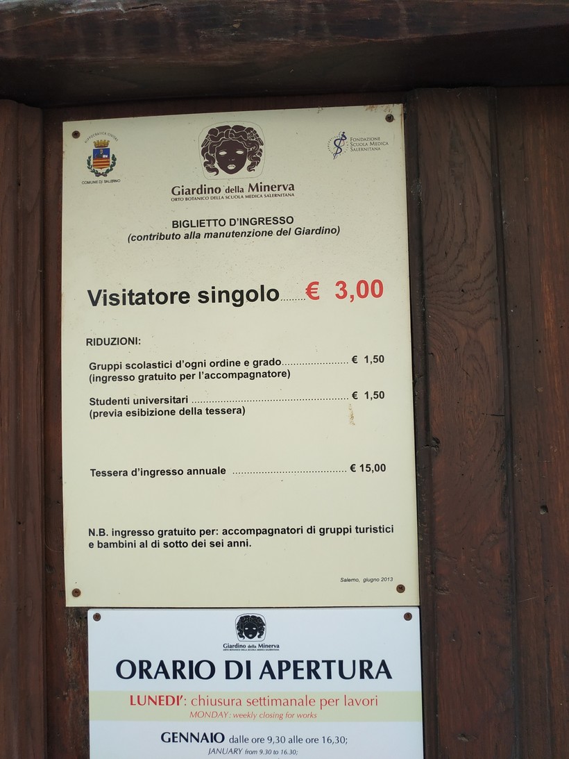 После собора мы хотели попасть в ботанический сад Миневры. Этот сад считается наиболее старым в Европе, и изначально его строили, чтобы выращивать лекарственные растения. Входной билет для взрослых стоит всего 3 евро, но в понедельник, когда мы были в Салерно, там оказался выходной.