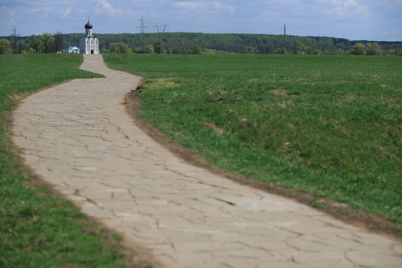 Позже мы с мужем часто заезжали в Боголюбово, чтобы встретиться с Покровской церковью. Но однажды обнаружили, что заветную тропу, ведущую к храму через луг, зачем-то заключили в искусственное покрытие, имитирующее то ли растрескавшуюся землю, то ли ещё что…