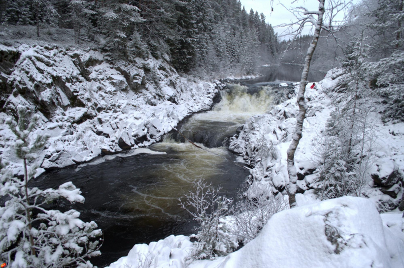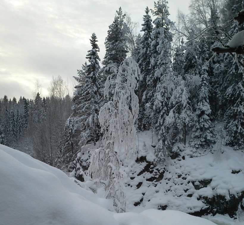 И вот, морозным днем, едем в Кивач. Не знаю, как в теплое время года, но зимой заповедник выглядит совершенно сказочно. При виде огромных мохнатых сосен, сугробов и заснеженной дороги мне почему-то сразу вспомнилась сказка «Морозко»: так и казалось, что он выйдет из-за ели и ударит своим посохом.
