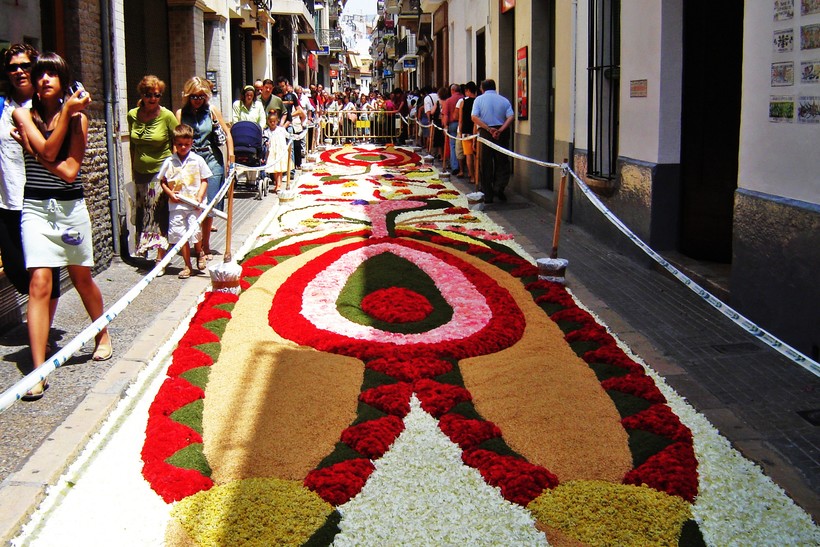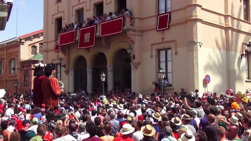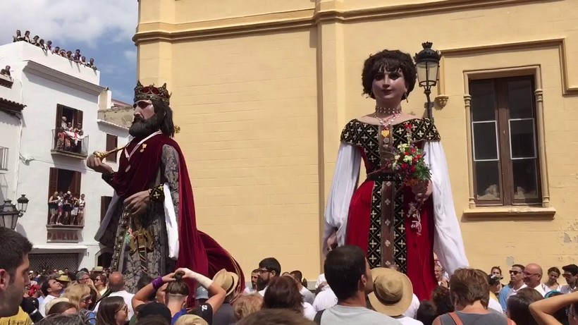 Мы заподозрили "неладное" за пару дней до начала главного шоу. Все было упарковано машинами, а когда, по обыкновению, мы отправились вечером на прогулку и поднялись к Храму, то увидели во внутреннем дворике за решеткой гигантские фигуры-куклы, которые явно были для чего-то приготовлены. Как удалось узнать позже, праздник проходит по строгому расписанию, и в нем задействовано большое число жителей города. Главное действо проходило 24 августа. Огромные куклы, сделанные из папье-маше, и изображающие Короля, Королеву, Святого Варфоломея, Святую Феклу и других персонажей выносили на себе специально подготовленные люди. Все это сопровождалось своеобразной довольно монотонной музыкой, которая исполняется на каталонских духовых инструментах. Куклы двигались по улицам города, иногда останавливаясь, поворачиваясь вокруг своей оси, исполняя своеобразный танец. К этому моменту на улицах собрались сотни людей. Огромная толпа следовала за процессией, перетекая из одной узкой улочки в другую. Оказывается, у праздника есть четкое расписание, и в каждый момент что-то происходит. Мы об этом не знали, поэтому прозевали вынос кукол из двора храма, а "поймали" их уже где-то в улочках, дальше нас подхватила и понесла толпа. С балконов украшенных домов свисают зрители, они приветствуют процессию. В квартиры к тем, кому посчастливилось жить в старом городе, набиваются десятки гостей.