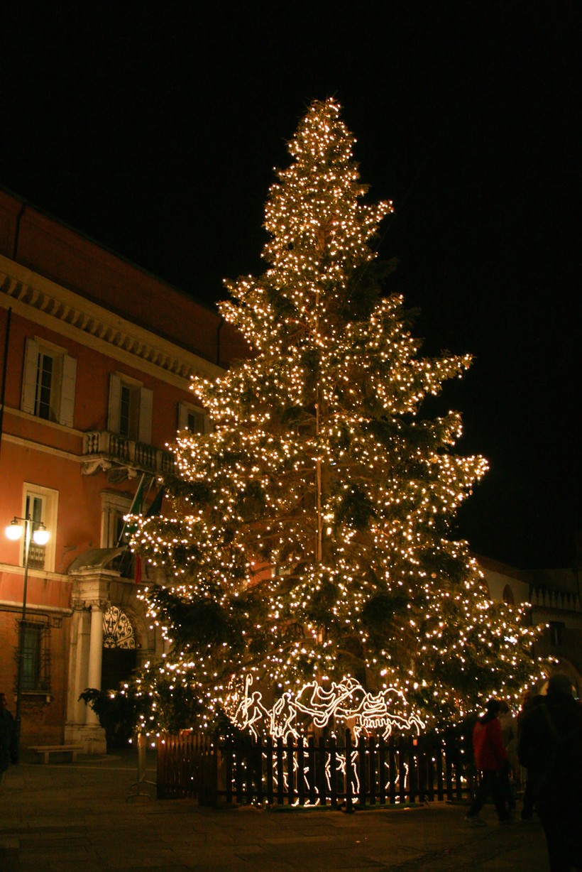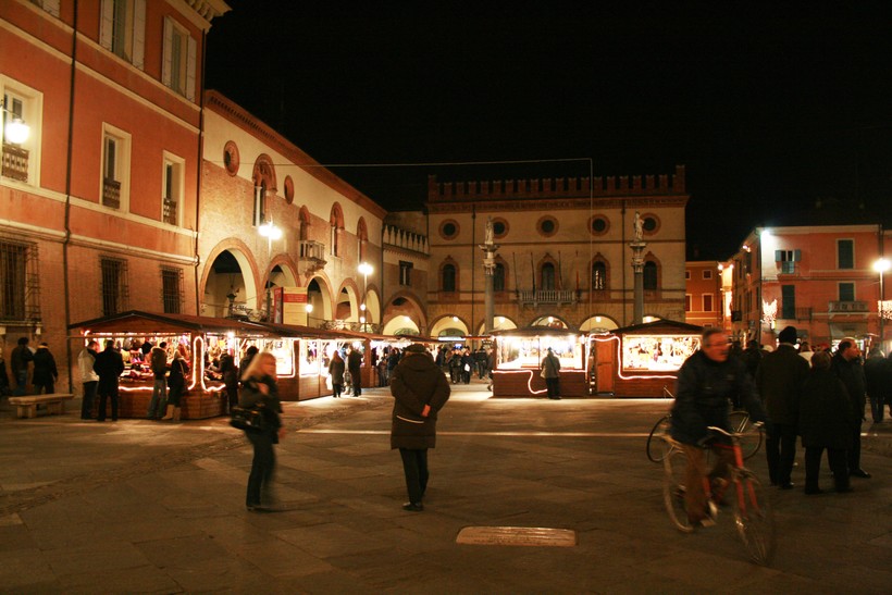 В Равенну мы попали уже в сгущающихся зимних сумерках. Стояли последние дни декабря, Рождество только что прошло, однако никому это не мешало праздновать и радоваться. Весь город оказался украшен, над каждой улицей висели длинные гирлянды, звезды, пожелания счастливого Рождества и Нового года. Гуляющего народы было довольно много; от вокзала мы шли по длинной торговой улице в настоящей толпе.