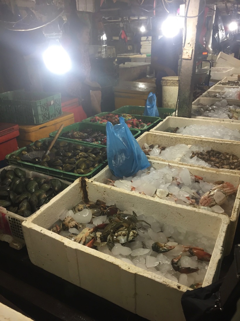 Мы заказали такси до рынка с морепродуктами, когда мы вышли - я была в ужасе, везде пахло рыбой, под ногами ужасная несусветная грязь. Никогда не ездите туда (именно на рынок) в открытой обуви! Так как там море рыбы, то и воды там море, вода постоянно льётся со всех прилавков с кусочками рыбы и смешивается с землёй под ногами, потому там выстилают все дощечками но это помогает слабо.