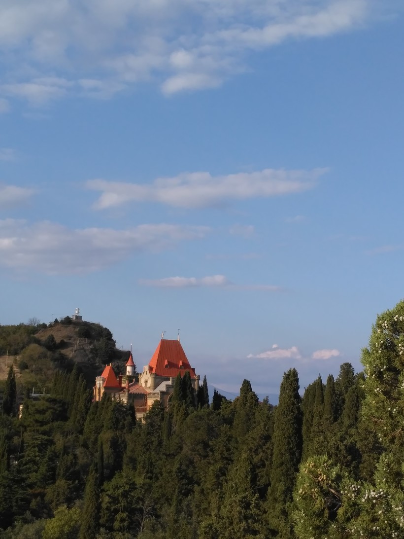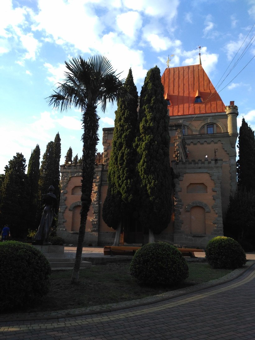 Дворец симпатичный, внутри сейчас столовая и бильярдная все того же санатория «Утес», но на территории можно спокойно находиться всем желающим. Заходить только нужно сюда через верх, внизу, около пляжа, охрана, забор и проверка документов. Территория благоустроена, есть кафе, небольшой магазинчик, где можно купить молочный коктейль (достаточно вкусный кстати), мороженое, кофе. И посидеть в тени хвойных деревьев вдыхая их чудный аромат, с высоты смотря на море, и поедая мороженое. Ну чем не отдых?