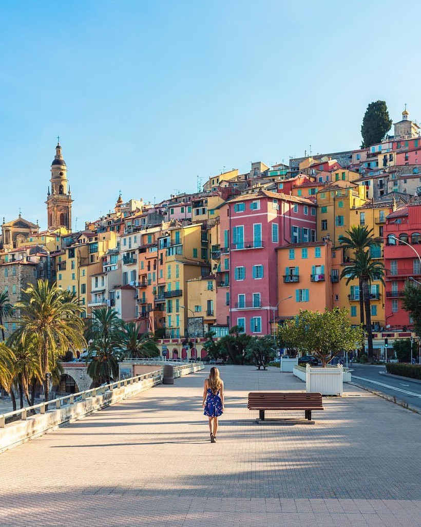Одна из самых главных эстетических фишек Ментона – застройка. Вернее, ее цвет. Он весь желтый, терракотовый и золотой! Это прекрасно смотрится и днем, в сочетании с глубоким синим небом и лазурным морем, а также вечером, когда заходящее солнце добавляет всем цветам насыщенности. Ты словно... я не знаю... сидишь на половинке разрезанного персика. И тебе хорошо, вкусно и тепло, и шкурка у персика бархатистая.