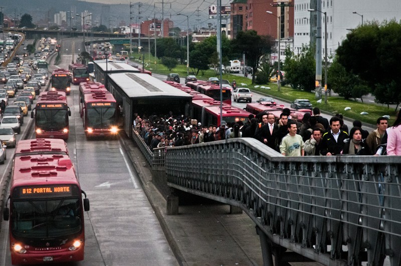 Знакомство с городом мы начали с… пробок. В семимиллионной Боготе улицы загружены в любое время суток. Здесь нет метро, его заменяет система скоростных автобусов Трансмиленио, по сути – «наземный сабвей». Автобусы курсируют по всему городу по выделенным на полосам, заезд на которые запрещен (и невозможен, потому что они отделены кирпичным бордюром).