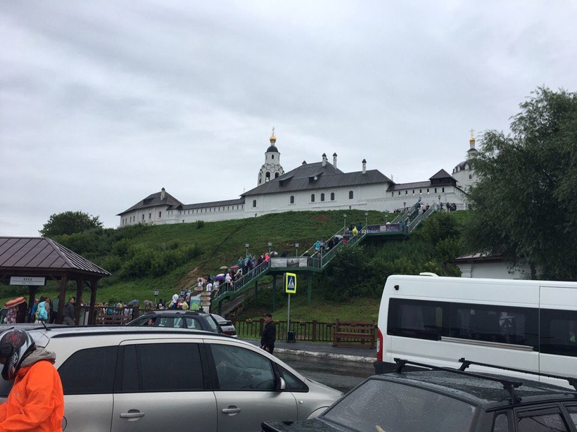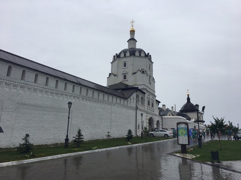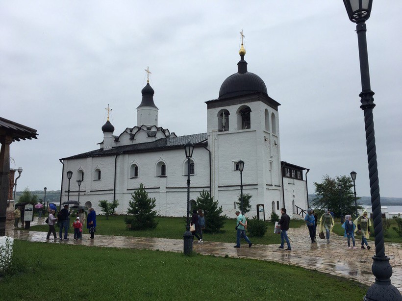 Остров-град Свияжск в конце июля встретил нас мелким дождём и прохладной погодой. Мы надеялись, что в связи с этим там не будет толп туристов, но зря… Это место - обязательный пункт посещения при несколькодневных экскурсиях в Казань. Подъезд к нему заставлен большей частью туристическими автобусами. Да и на территории комплекса люди группами ходят от здания к зданию и слушают экскурсовода.