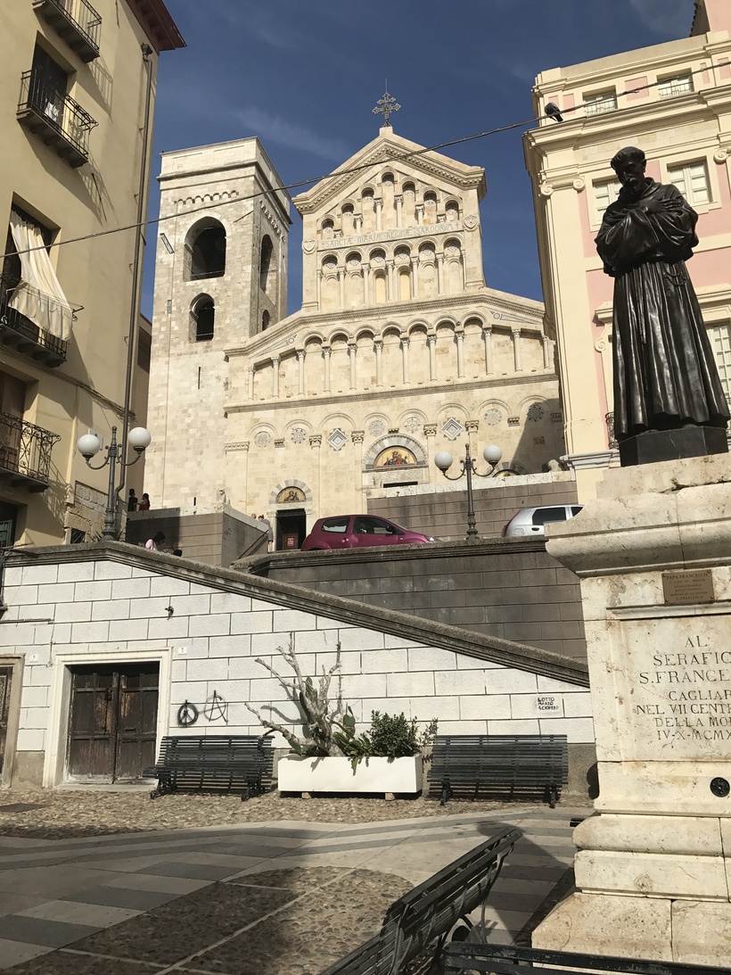 С достопримечательностями в Кальяри не очень густо, хотя город с богатой историей. Да как-то она в нем архитектурно не зацепилась. Есть парочка соборов; к одному из них мы поднялись и долго там тусовались, ибо открывается от его подножия изумительный вид на город. В свою вторую, не так давно случившуюся поездку на Сардинию я снова туда возвращалась; и знаете, вот ничего не изменилось! Все так же играли на площади дети из ближайшей школы, все так же недовольно шевелили листьями пальмы, возвышался собор непередаваемого розоватого оттенка, а крыши были рыжими. Стабильность, боже, вот она.