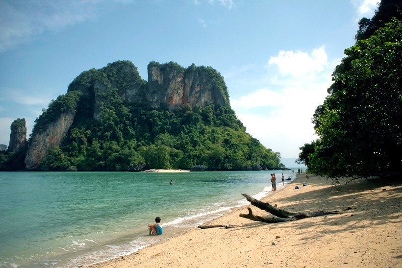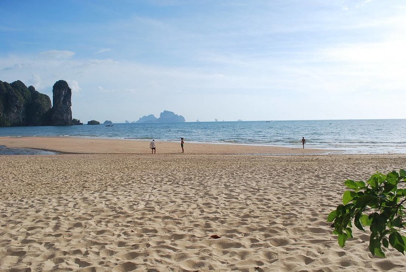 Несмотря на европеизированность и сервис, пляж в Ао-Нанге не очень хорош. По сравнению со многими другими тайскими пляжами, тут песок смешивается с глиной, и консистенция получается... сами понимаете. Вода довольно мутная. В море впадает мелкая речка, полагаю, что не очень чистая. Местным детям нормально, а вот мы близко не подходили. И отливы здесь сильные, из-за чего берег превращается в болото. Но в остальном – вид неплохой, возвышающиеся вокруг пляжа скалы дарят очень живописную картинку. Речь идет именно о городском пляже, там где-то есть еще соседний, куда мы не дошли.
