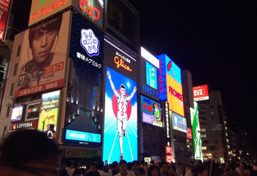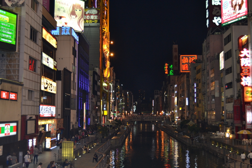 И напоследок, хочу вам рассказать о нашей замечательной прогулке по Dotonbori. Это было что-то яркое, словно вспышка. Кругом столько красок! Горящие вывески, магазинчики с едой, забегаловки, бары и караоке. Всё гремит, люди ходят туда-сюда и мы – стоящие по среди всей этой суматохи. Трудно передать словами все полученные мною ощущения, но одно я скажу точно – вам нужно побывать здесь хотя бы раз в жизни.