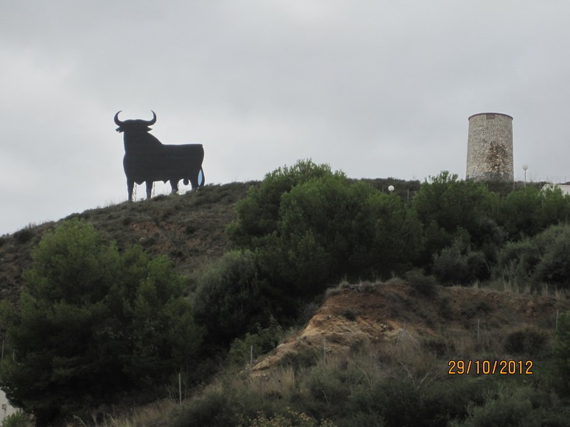 Интересной фишкой мне кажется знаменитый бык, который смотрит на город и море с высокого холма. Такие быки встречаются по всей Испании. В 1956 году группа Osborne (их бренди Veterano и Magno известны повсеместно) заключили контракт с рекламным агентством на создание дизайна для презентации бренди Veterano. Дизайнер Маноло Прието предложил использовать фигуру быка на дорогах Испании со слоганом “El toro de las carreteras” (Бык всех дорог).