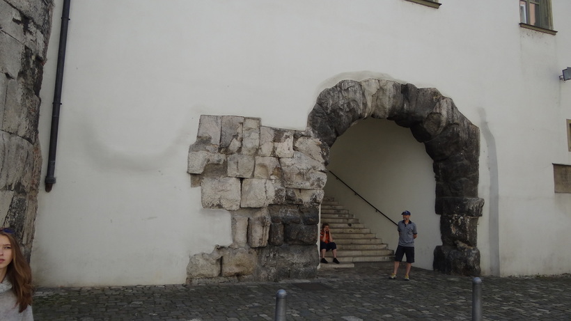 - Римские укрепления. А они в Регенсбурге буквально вмонтированы в более поздние здания и смотрятся очень необычно. Представьте себе конструкцию из древних массивных каменных блоков, из которой «вырастает» более поздняя и более изящная постройка.