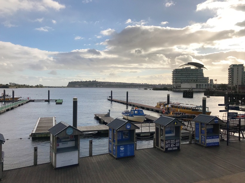Здание с конструкцией на крыше, похожей на дракона – это пятизвездочная гостиница Сент-Дэвид (святой Дэвид является покровителем Уэльса).