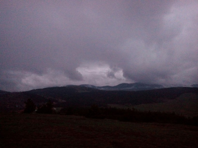 Поднялись к памятнику мы уже в сумерках и оказались прямо в дождевом облаке. А над соседними вершинами уже вовсю лило, с севера надвигалась гроза, о чем предупреждали яркие вспышки в черной туче. Если честно, ощущения непередаваемые: ты на вершине мира, прямо в небе. Вокруг – никого, только приближающаяся буря и порывы ветра. Жутко, аж дрожь пробирает и дыхание захватывает.
