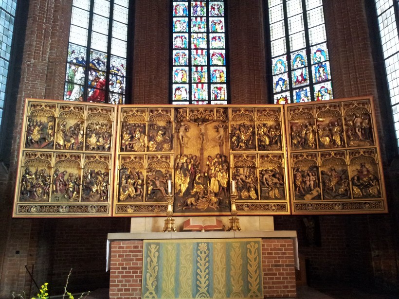 В городе довольно много различных церквей; понятно, что совершать по ним тур мы не стали, ограничились тем, что попалось нам под руку во время прогулки по центру. Объектом нашего пристального внимания стала так называемая Рыночная церковь – чудное здание в стиле кирпичной готики, возвышающееся над старинными домами. Она вместе со зданием старой ратуши и несколькими другими домами в том же стиле образует прекрасный ансамбль Рыночной площади; одно удовольствие – полюбоваться на это кирпичное единодушие.