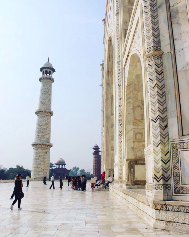 Это воистину самое живописное воплощение погребальной культуры моголов, так как Тадж - совсем не храм или дворец, а настоящий мавзолей, построенный Шахом-Джаханом. Для того, чтобы узнать всю историю места можно оплатить на входе англоязычного гида, либо вооружиться информацией из интернета (что я конечно и выбрала). Мне хотелось заснять это белоснежное чудо на фоне чистого неба, поэтому пришла я туда к открытию, пока смог не затянул Агру.