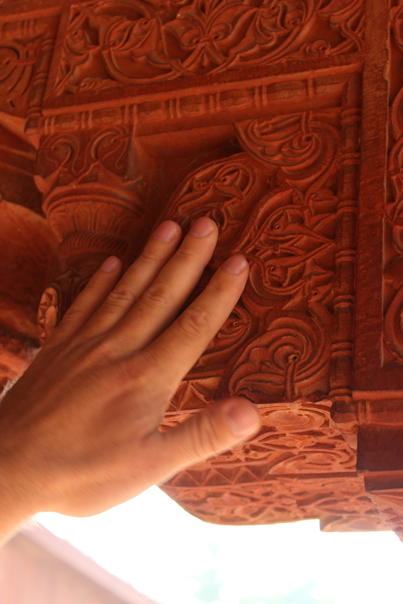 Следующее место, куда я страстно желала попасть - Красный Форт, являвшийся резиденцией Акбара Великого, правителя моголов. Тут кстати провел остаток своих дней Шах-Джахан, заточенный своим собственным сыном в комнату, имеющую вид на Тадж Махал. Но помимо этого, я хотела увидеть еще два объекта. Один из них - большой каменный трон куда попало ядро из пушки в период войны с Англией. Вторым является место напротив трона, с другой стороны балкона, откуда создается оптическая иллюзия и "картинка с Таджем" приближается.