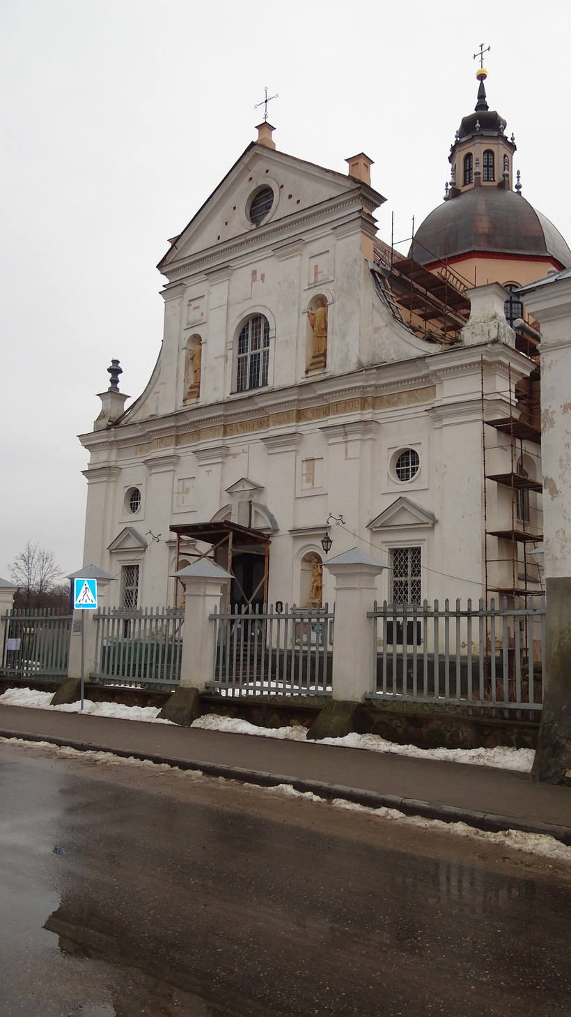 Фасад костела действительно во многом похож на его римского «старшего брата», а вот стоящая рядом башня-колокольня, больше похожая на крепостную, уже является отличительной особенностью данного конкретного сооружения. Кстати, многие сведения о костеле и городе в целом я узнал от гида Светланы Саленик, с которой я предварительно списался, чтобы она провела экскурсию по замку.
