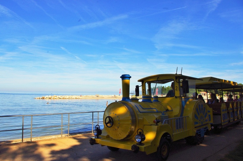 - Курортная атмосфера. Сам городок Умаг очень маленький. Отели, в основном, сосредоточены вдоль береговой полоски. На всём протяжении (20 км) есть променад, который используется для пеших прогулок, пробежек, катания на велосипеде и прочего. Параллельно с ним ходят электро-паровозики – специальные вагончики, которые не загрязняют окружающую среду (стоимость проезда 20 HRK для взрослых, 10 HRK для детей).