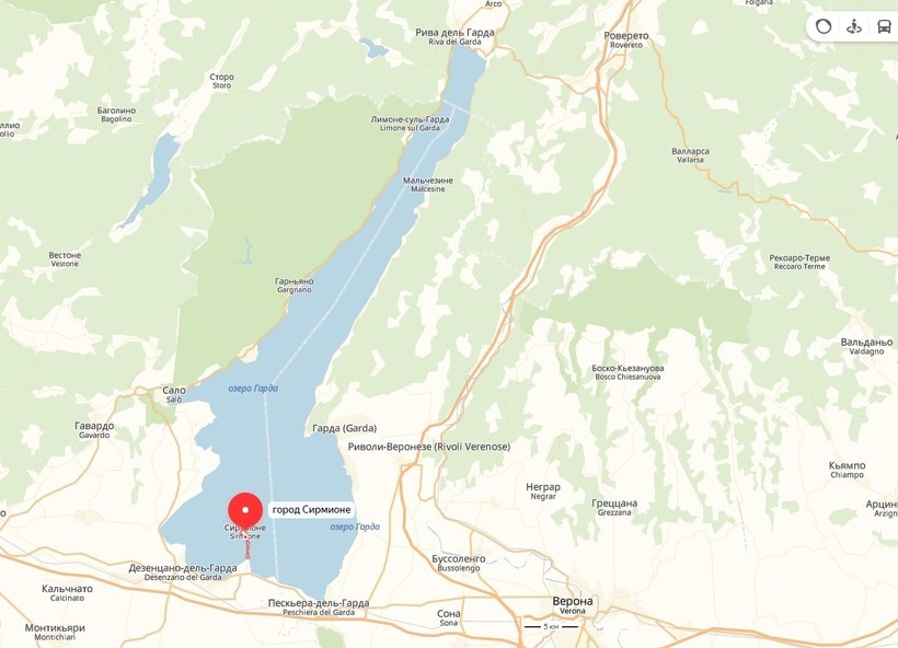 Сирмионе – городок на берегу озера Гарда. И это идеальное место для исследования самого озера и его достопримечательностей. Я приехала в него из Вероны – добираться удобно рейсовым автобусом, а если средства позволяют, то можно и такси заказать – ехать здесь менее 40 км. Из Сирмионе Вы всегда легко сможете уехать, а вот остальные места озера Гарда как закольцованные проходные комнаты – чтобы выйти, придётся вернуться в Сирмионе.
