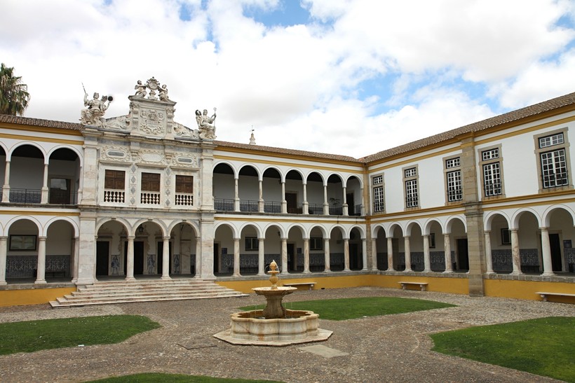После собора по узеньким улочкам мы пошли к университету Эворы, который знаменит своей непростой историей и плиткой азулежу. Университет действующий, так что во время занятий вас не пустят внутрь. А вот на каникулах можно побродить по всем классам. Стены расписаны азулежу, в каждой комнате изображены разные сценки из жизни. Мы с удовольствием посмотрели их все, тем более внутри можно было ненадолго спрятаться от жары.