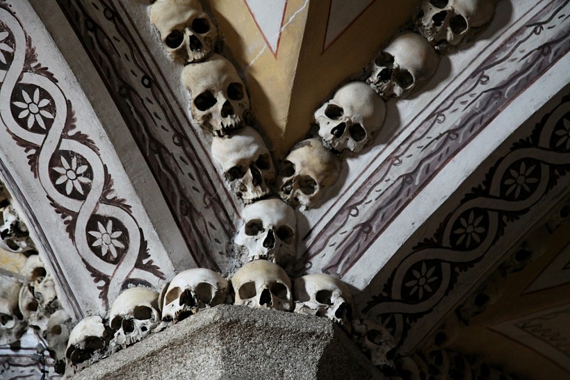 Затем мы вернулись в центр, к руинам римского храма Дианы и небольшому скверу, а оттуда пошли к самой интересной достопримечательности – Часовне Костей. Её стоит посетить, так как место уникальное. Часовня, построенная из человеческих костей и черепов, мало кого оставит равнодушным. В туристический сезон людей очень много, так что придется потолкаться, чтобы подобраться поближе к ограждению и всё рассмотреть. На входе вас встретит жизнерадостная надпись: «Nós ossos que aqui estamos pelos vossos esperamos», т.е. "Мы, кости, которые лежат здесь, ждём ваши."