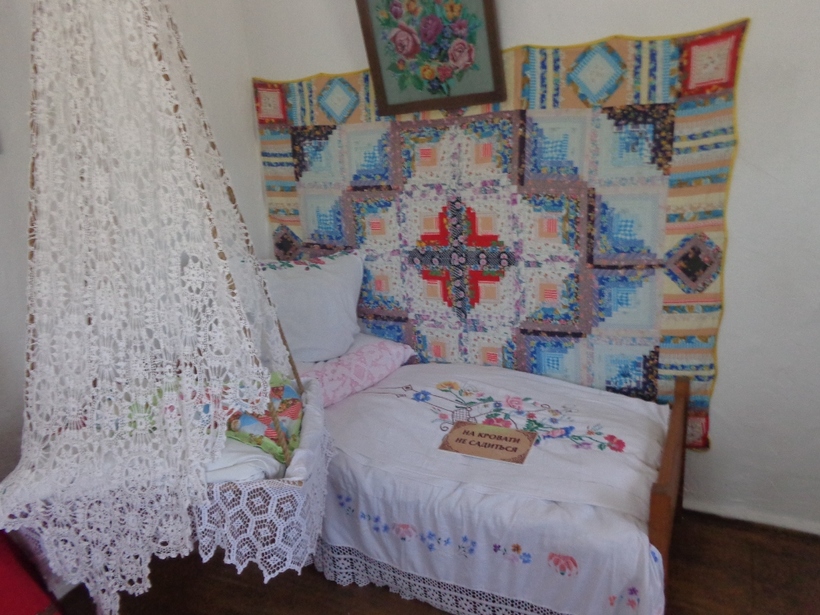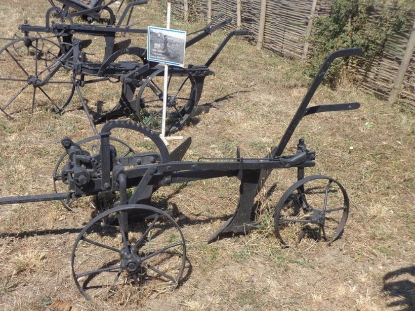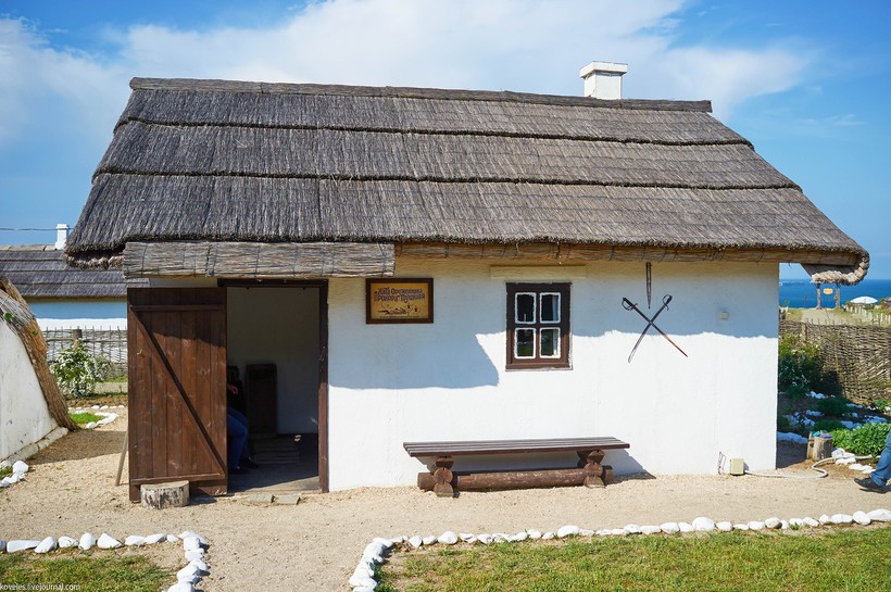 На плане хорошо видно, что комплекс напоминает старинное поселение с площадью в центре и небольшой церквушкой. В первый раз мы просто растерялись и не знали, что посмотреть сначала. Потом решили, что лучше пойти направо. Это направление более живописное, потому что можно еще и любоваться морем. На воротах перед каждым домиком имеется надпись, сообщающая, кто здесь жил – пекарь, гончар, купец, ткач, портной, атаман или простой казак. Видно, что все экспонаты подлинные, да и сами хаты сделаны по старинной технологии. Меня заинтересовала мини-выставка швейных машинок и разных утюгов, а муж долго рассматривал старинные плуги.