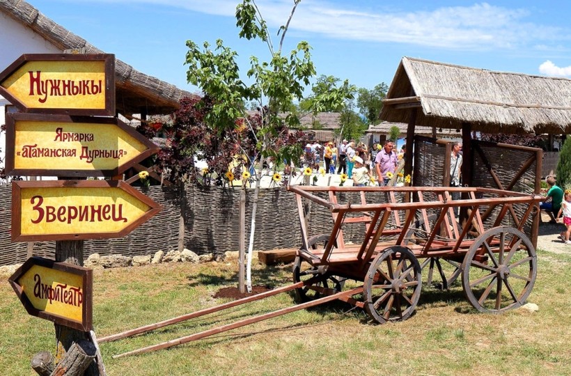 От этнографической деревни мы не ожидали многого. Думали, увидим пару домиков (у нас, например, в городе есть национальная деревня, и в ней не больше 10 домов) да несколько переодетых казаков. Но Атамань оказалась огромной. Здесь множество дворов, детская площадка, несколько кафе и даже зверинец.