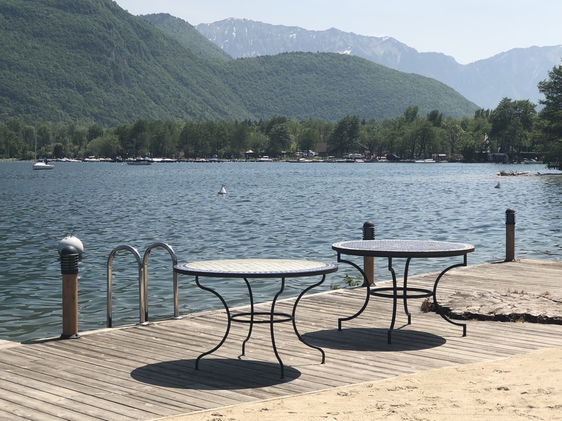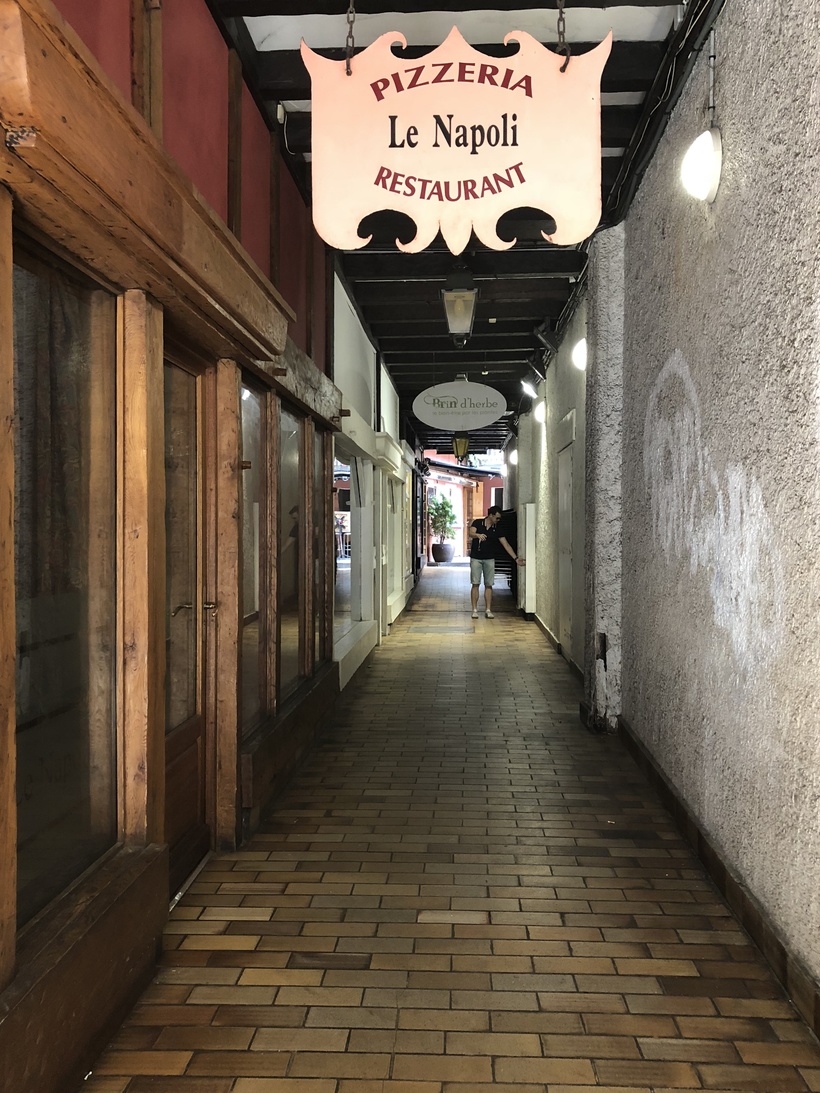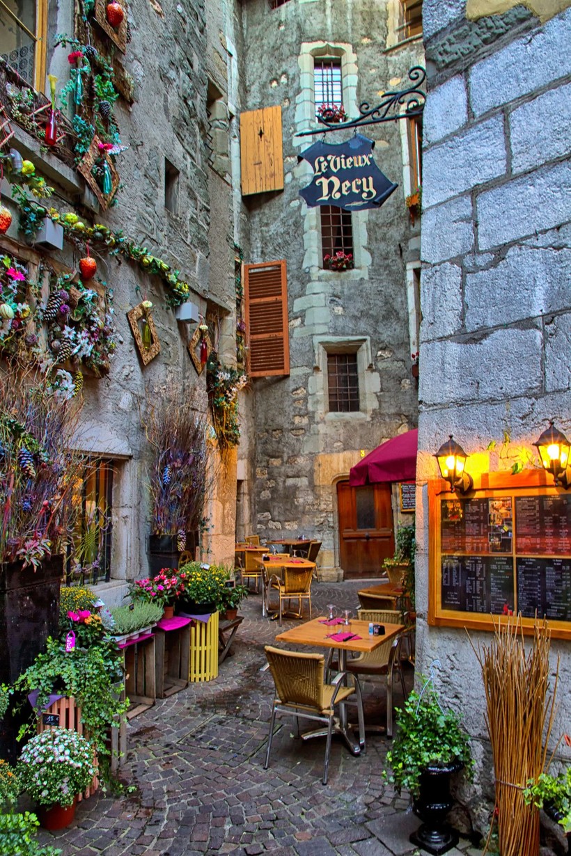 Про рестораны отдельно скажу. Кое-какая еда у нас была с собой, но все-таки мы решили в Анси пообедать. И столкнулись с муками выбора. Мы любим сидеть в красивых местах, а в этом городе они красивые ВСЕ! То есть идешь и мучительно выбираешь ресторан, и они абсолютно прекрасны, с кучей милых деталей, уютные, меню разнообразное. Мы чуть с ума не сошли, но все-таки решились по принципу «давай в третьем вот от этой точки». Не прогадали.