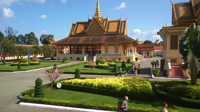 Достопримечательность №2 в Пномпене – это Королевский дворец. Величием и масштабами он, конечно, уступает бангкокскому, зато в нем не так многолюдно и вход стоит дешевле (25 000 риелей). Внутри – симпатично, ухожено, фотогенично.