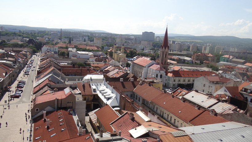 - Костел Святой Елизаветы. Это визитная карточка Кошице. Мощное готическое основание венчает изящный барочный купол, в цветовой гамме которого сочетаются черный и золотой цвета. Дело было 30 мая, и в самом костеле шла служба, а вот на колокольню за 2 евро мне удалось подняться. Возможно, это единственная полноценная смотровая площадка в старой части Кошице. Только решетка немного портит впечатление, хотя объектив моего любительского фотоаппарата через нее свободно проходит.