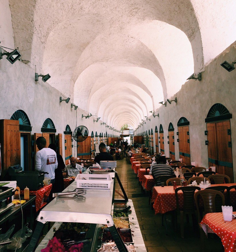 Она находится в старом городе посреди рынка. Чтобы попасть внутрь нам пришлось ждать в очереди минут пятнадцать. Зал неказист, но практически всегда полон до отказа. Хумус подается в купе с овощами и традиционной питой. Причем кроме привычного всем холодного хумуса, здесь есть еще и горячий в вперемешку с жареным фаршем из баранины. Я думаю, что это не очень полезно, но безумно вкусно. Но несмотря на относительную дешевизну Акко, цены по российским меркам здесь все равно кусаются. Порция холодного хумуса со всеми сопутствующими ингредиентами и напитком обойдется вам в тридцать – тридцать шесть шекелей или десять-двенадцать долларов. Но в целом для дорогого Израиля эта стоимость просто подарок. Ведь цена полноценного обеда здесь стартует здесь от шестидесяти шекелей или двадцати долларов.