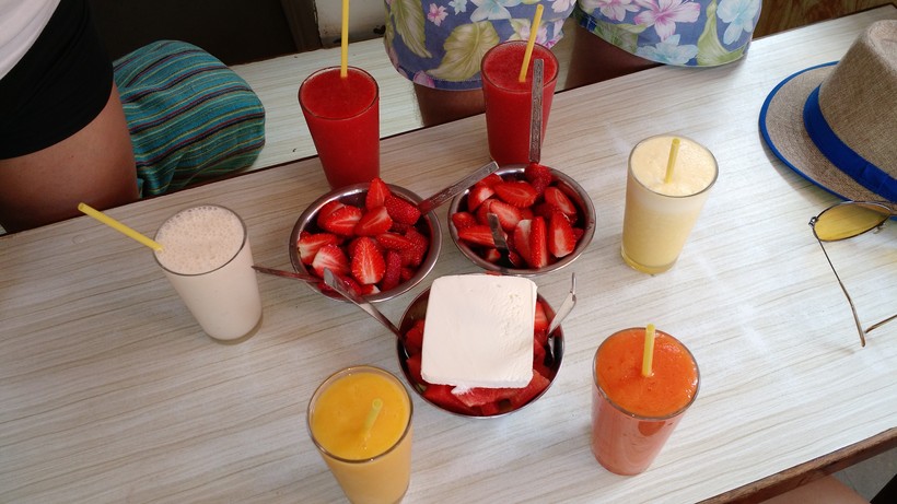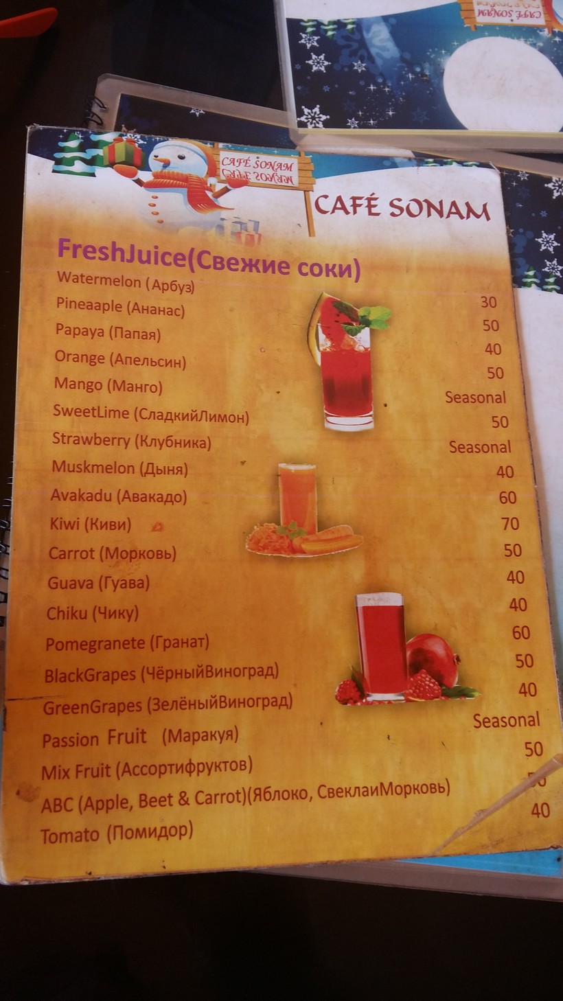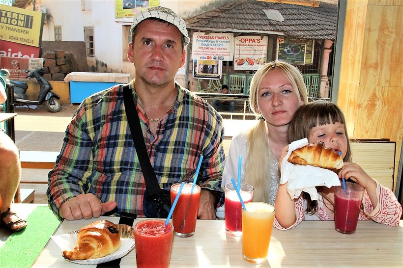 Множество кафе расположены по дороге к пляжу, тут кухню каждый выбирает на вкус, цвет и кошелек. Для нас же самым любимым был конечно знаменитый Джус центр! Думаю, что приехать в Гоа (северный) и не побывать в Джусике сопоставимо с визитом в Питер и игнорированием посещения Эрмитажа). Справедливости ради надо заметить, что джусиков там два: в одном на кассе принимает заказы мужик (для меня так и осталось загадкой, как он запоминает, кому что потом приносить), в другом - женщина средних лет. Цены сопоставимы, но мы заметили, что в том, где женщина, выбор был чуть больше, но и ждать тоже приходилось дольше. Еще обязательны к пробе фруктовые салаты. Только будьте осторожны с клубникой (это из личного опыта) в первую поездку я несколько переусердствовала (клубничный фреш +клубничный салат минимум 2 раза в день), по возвращению домой получила очень сильную аллергию, теперь не могу есть клубнику вообще. Так что чередую другие соки, которые тоже очень крутые.