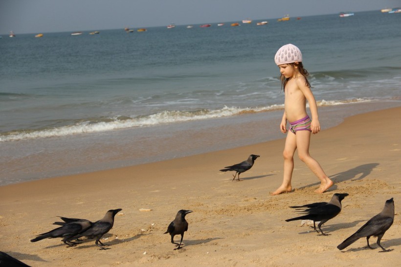 Меня очень удивило, когда поняла: несмотря на единую линию, пляжи Северного Гоа отличаются друг от друга не только песком, растительностью, ресторанчиками, но и животными. Пляж Анжуны атаковали чёрные, наглые вороны.