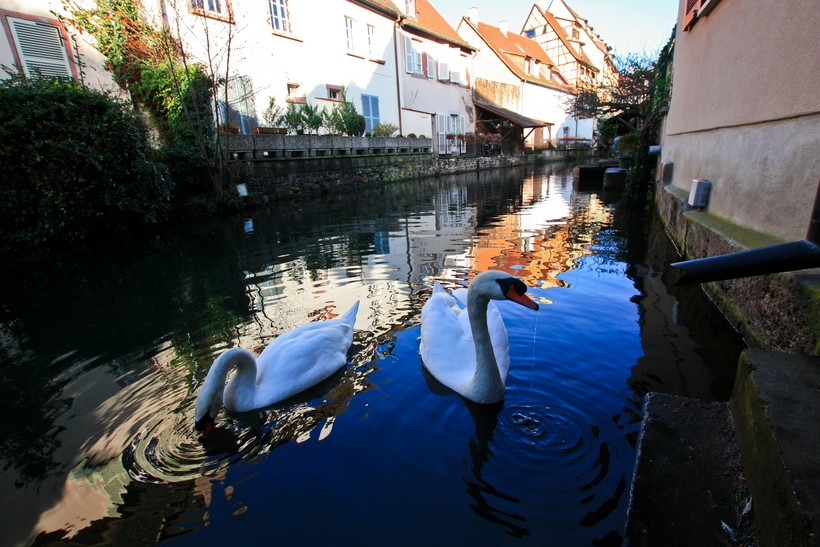 3. С погодой, несмотря на зимнее время года, нам очень повезло: выглянуло солнышко, и показалось голубое небо. Мы воспользовались шансом и отправились в квартал "Маленькая Венеция" (La petit Venice). Он начинается от площади «шести черных дорог» (Pl. De Six Montagnes Noires). Набережная реки Лаух окружена разноцветными фахверковыми домиками. Летом они утопают в цветах, увы, у нас было далеко не лето. Однако с солнцем стало так тепло, что можно было даже снять куртки. Именно здесь нам посчастливилось покормить ручных лебедей на берегу канала. Это было так мило: кормить птиц печеньем, привезенным из дома.