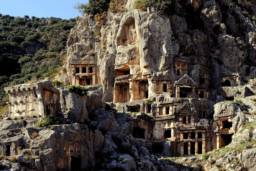 - В самом античном городе Мира, а точнее в том, что от него осталось, на обозрение представлены древние ликийские гробницы и греко-римский театр. И если вторая достопримечательность самая, что ни на есть уже обычная, то первая вызывает интерес. Дело в том, что ликийцы верили, что если человека похоронить поближе к небесам, то это ускорит процесс попадания туда. Поэтому своих ушедших в мир иной близких, они хоронили в гробницах, высеченных в скале. До нашего времени сохранилась большая часть из них, а также своеобразные памятники и домики для усопших, высеченные в горе. Не могу сказать, что это прямо ввело меня в дикий восторг, но полезно для расширения кругозора.