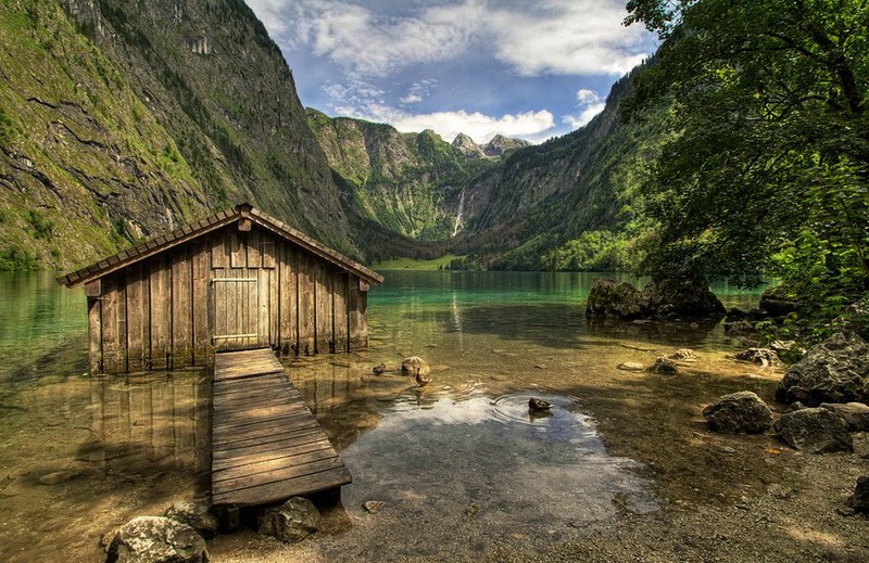 - Озеро Оберзее. Расположено на другом конце озера Кенигзее. Добраться до него можно только преодолев водную гладь Кенигзее. Затем придется прогуляться между гор примерно 15 минут и, о чудо, вы попадаете в место, которое когда-то казалось вам нереальным, существующим только на картинках. Оберзее меньше Кенигзее, оно похоже на слезу, упавшую в горах. Вдоль озера есть тропа, ведущая на противоположный берег, а далее к горным водопадам. Место потрясает своей красотой. Воздух там необычайно чист и свеж, первозданную тишину нарушает лишь пение птиц и звуки воды, спускающейся с гор, создавая при этом эхо.